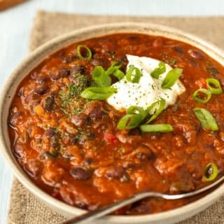 This simple stew is made with black beans and a rich tomato sauce. I love this served any number of ways – with rice, over a jacket potato, or just on its own with some tortilla chips to scoop it up!