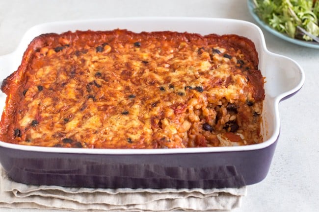Rice, beans, rich tomato sauce, all topped with crispy cheese… this one is really irresistible, and is perfect for cooking for a crowd!