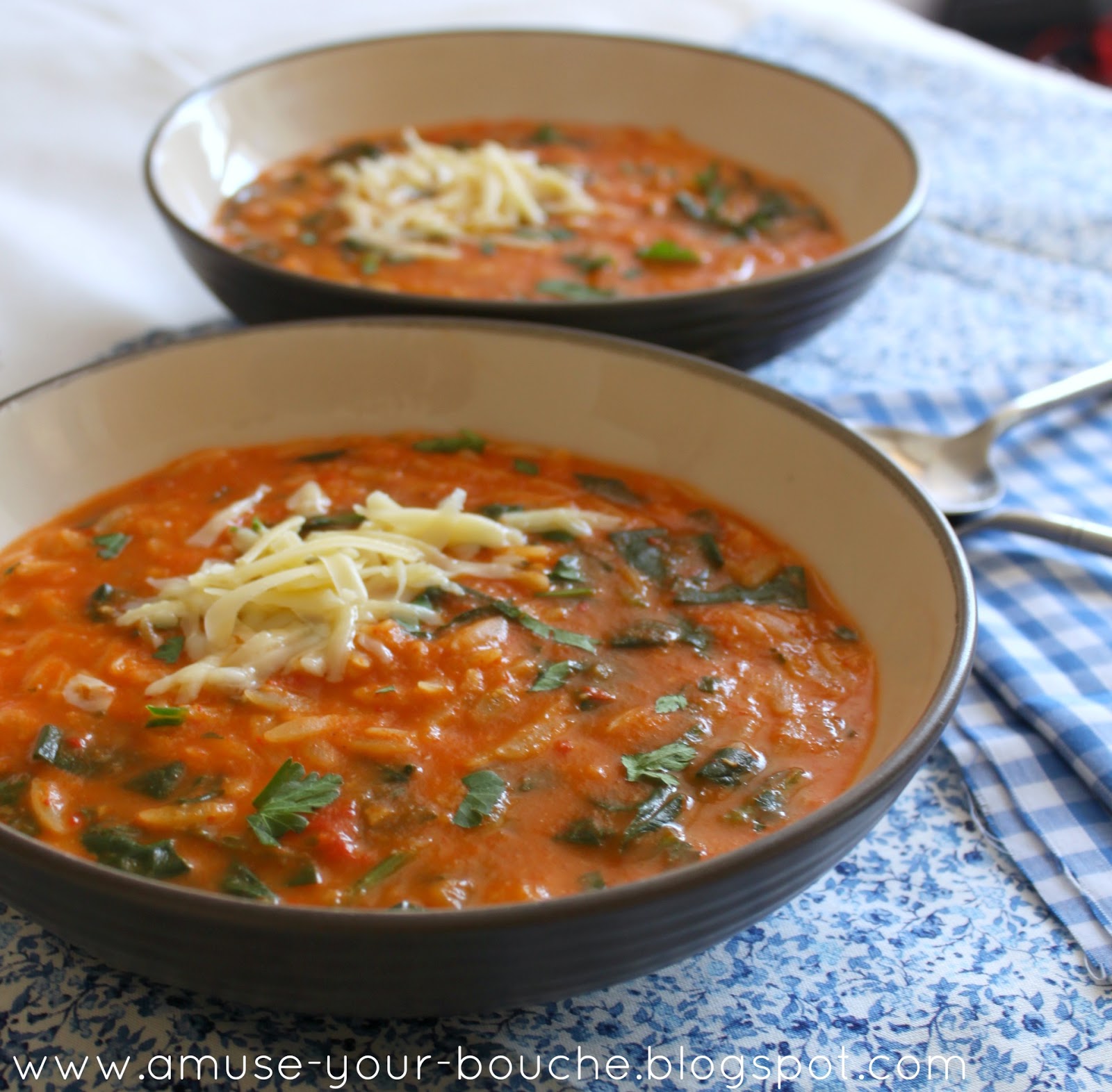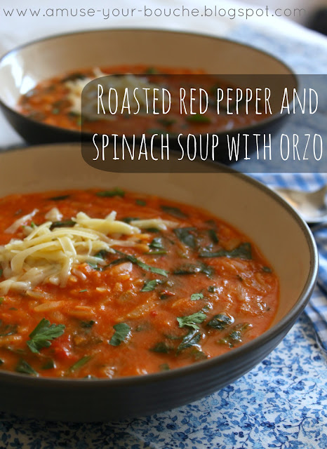 Roasted red pepper and spinach soup with orzo